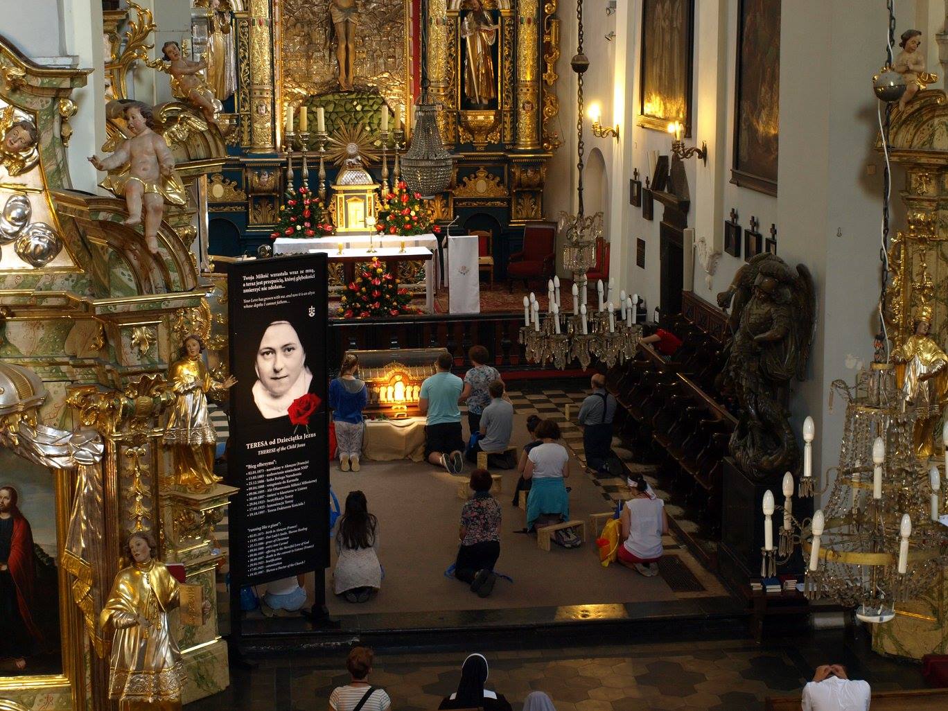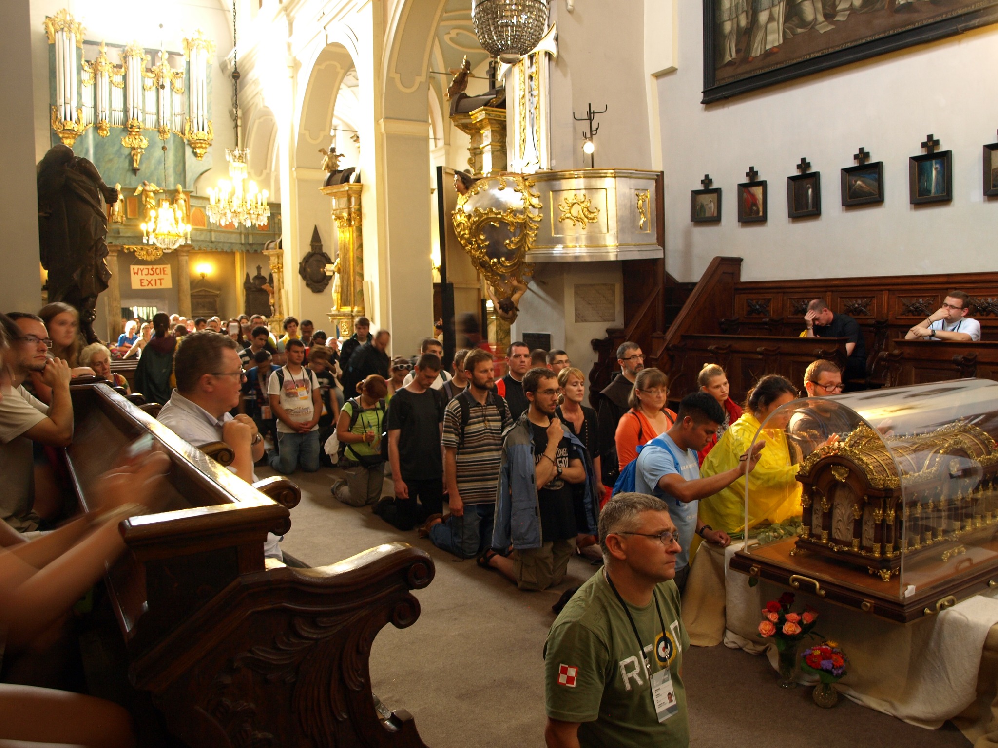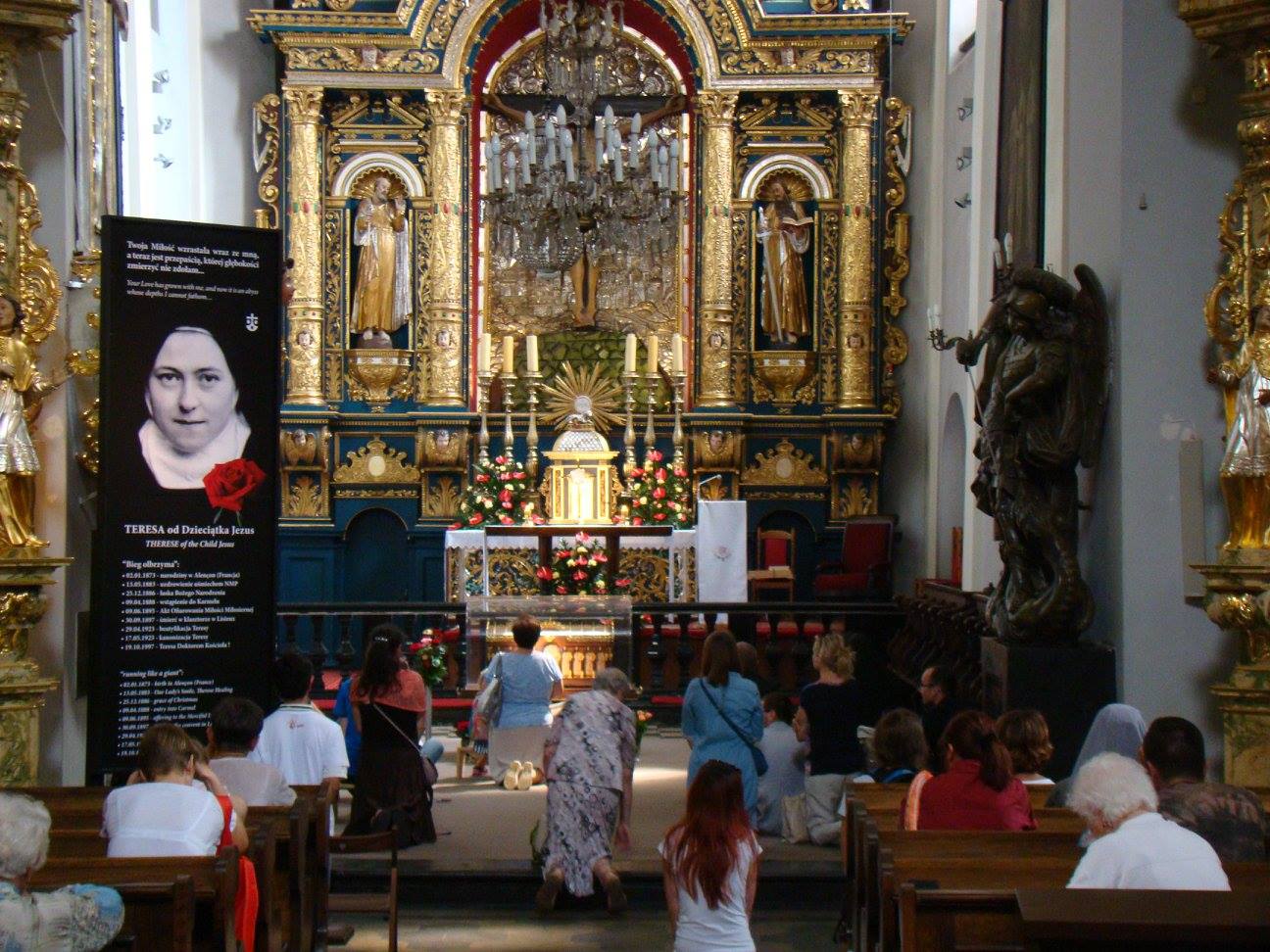 Wczoraj wielu z naszego świętomarkowego środowiska miało okazję nawiedzić kościół św. Wojciecha na Rynku i pomodlić się przy relikwiach św. Tereski z Liesieux, które właśnie tam (od popołudnia do 6.30 dnia dzisiejszego) były wystawione. To niezwykłe nawiedzenie przypomina wydarzenie z czasów ŚDM w Krakowie, kiedy w naszym kościele była Strefa Ciszy i właśnie wystawione były u nas relikwie św. Tereski. Młodzi czekali w kolejce, by się dostać do środka i w ciszy pomodlić się przy relikwiach tej małej, a potężnej karmelitanki. Poniżej kilka zdjęć z wczorajszego dnia oraz kilka migawek z czasów ŚDM.