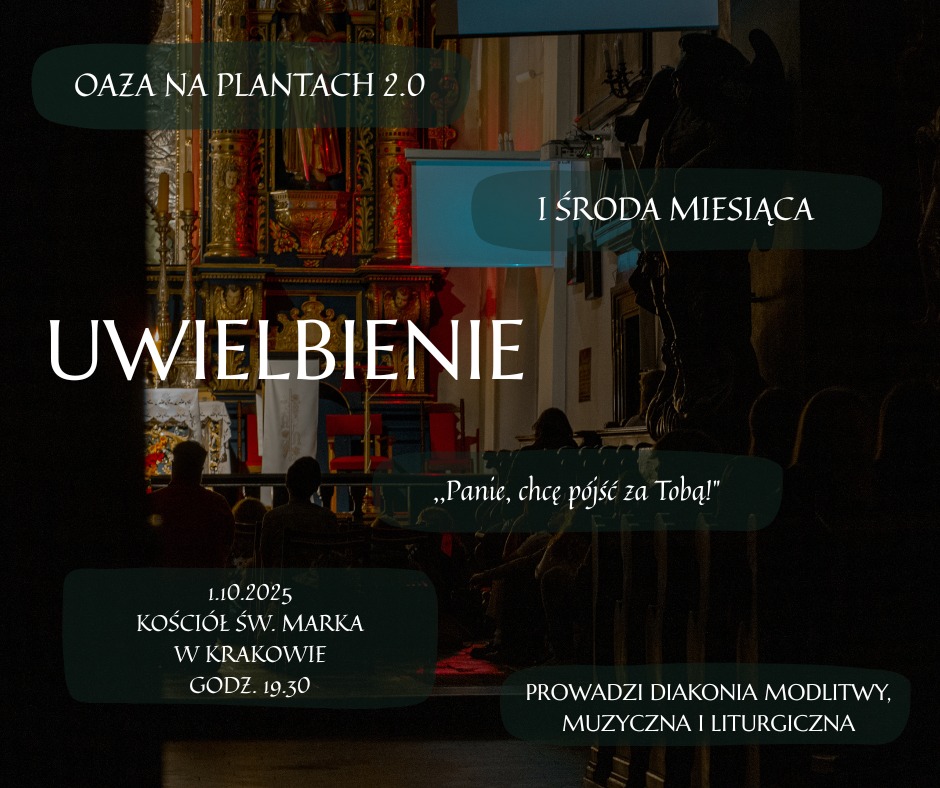 W środę 1.10.2025 o godz. 19.00 w kościele św. Marka Ewangelisty w Krakowie odbyło się pierwsze powakacyjne uwielbienie w ramach spotkań Oazy na Plantach 2.0, prowadzone przez Diecezjalną Diakonię Modlitwy Kraków, Diecezjalną Diakonię Muzyczną Archidiecezji Krakowskiej oraz Krakowską Archidiecezjalną Diakonię Liturgiczną.