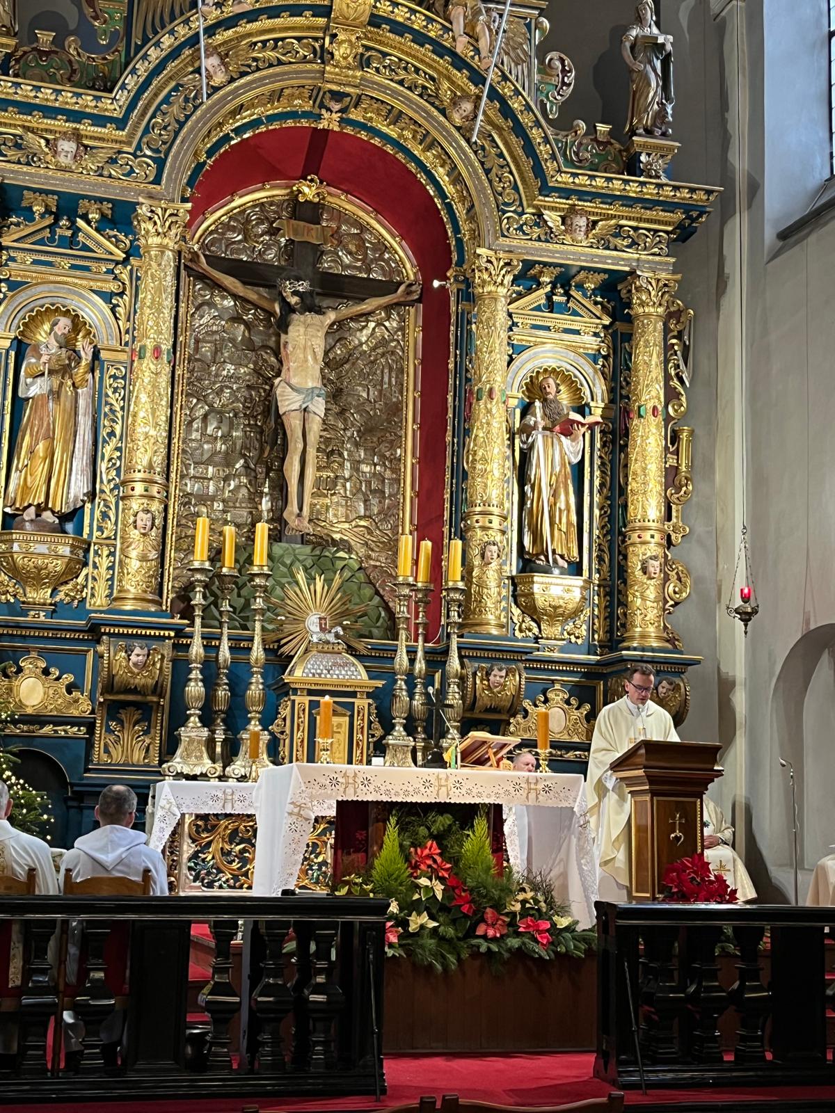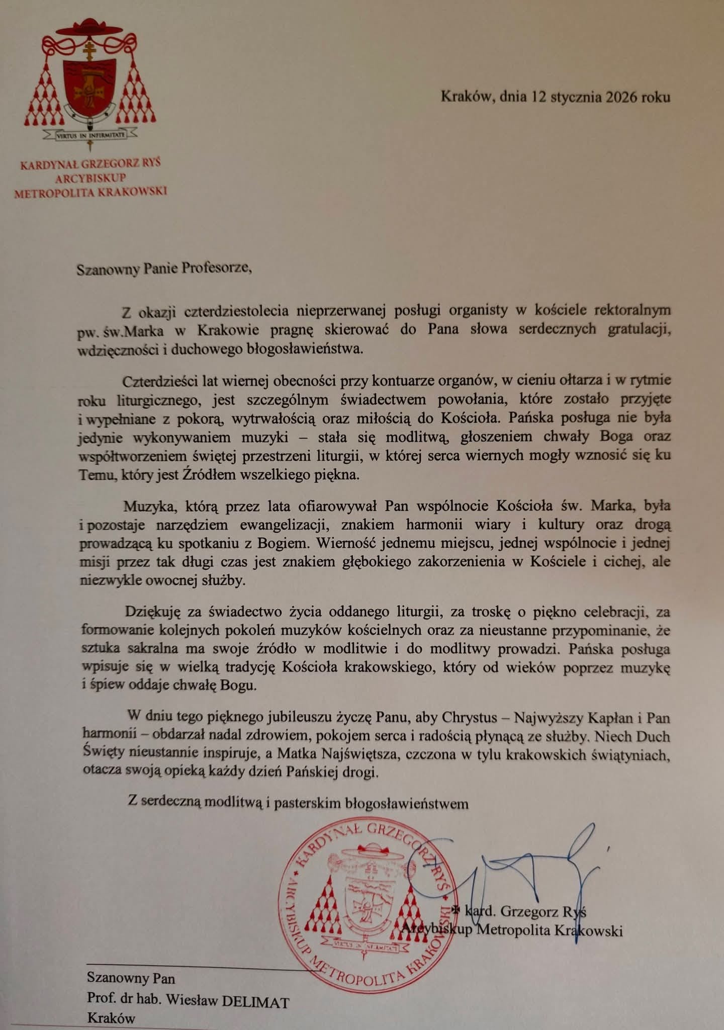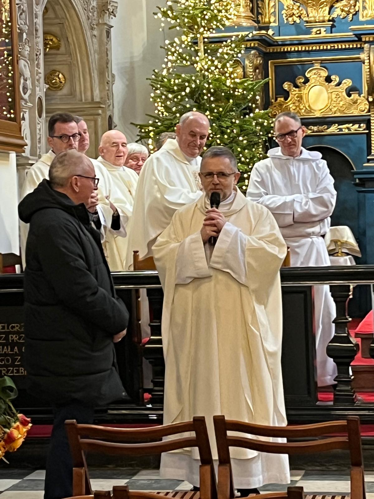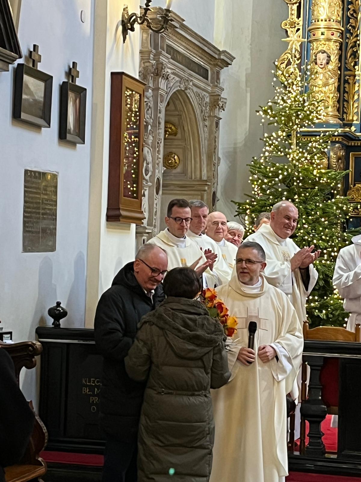 Dzisiaj podczas uroczystej Mszy świętej o 11.30 dziękowaliśmy za jubileusz 40-letniej organistowskiej posługi Pana Profesora Wiesława Delimata w naszym kościele. Eucharystii przewodniczył ks. prałat Franciszek Motyka, homilię wygłosił rektor Uniwersytetu Papieskiego Jana Pawła II w Krakowie – ks. profesor Robert Tyrała. Na tę okoliczność list gratulacyjny do pana Profesora Wiesława Delimata skierował także Ks. Kardynał Grzegorz Ryś. Byli zgromadzeni zaprzyjaźnieni kapłani i przyjaciele pana Profesora. Szczególne podziękowania do Jubilata skierował rektor naszego kościoła – ks. Andrzej Wójcik. Po Mszy świętowanie było kontynuowane podczas uroczystej agapy z przyjaciółmi związanymi z panem Profesorem oraz z osobami posługującymi w naszym kościelem – wśród wspomnień i wyrazów wdzięczności.