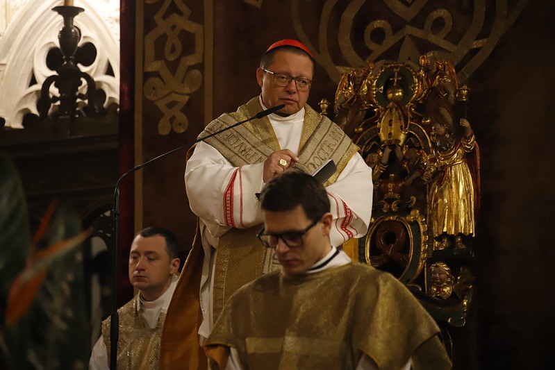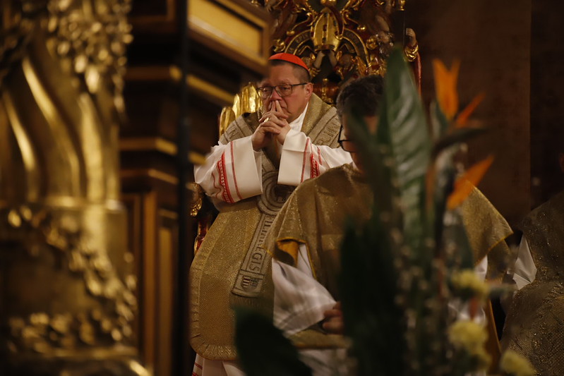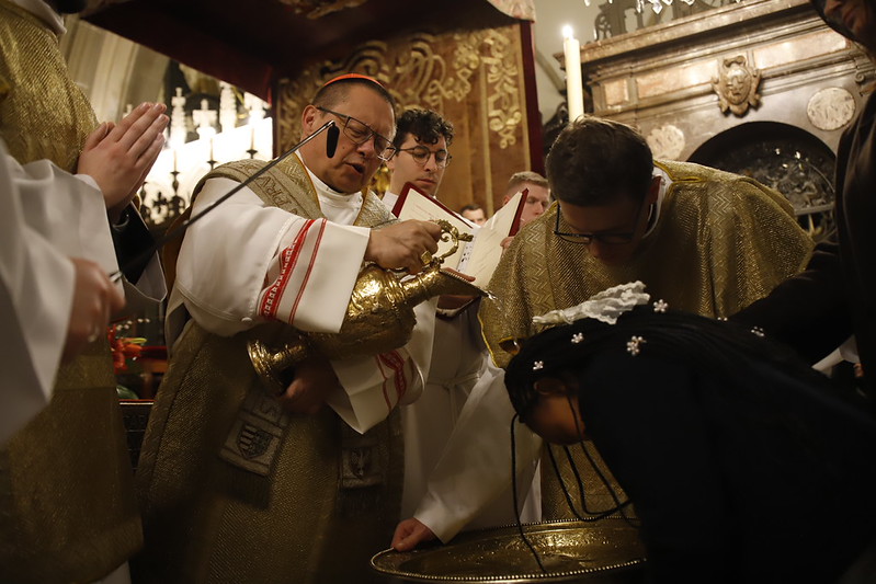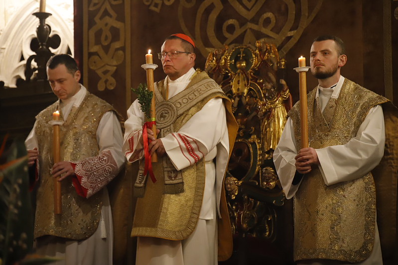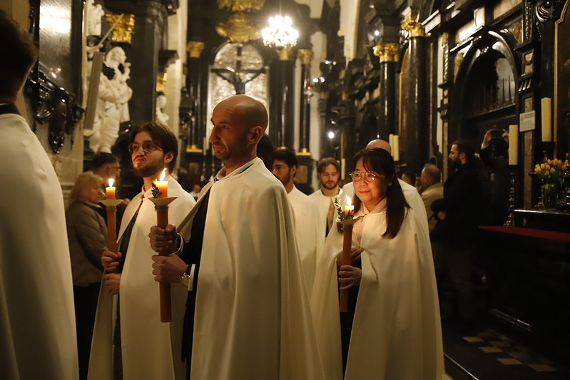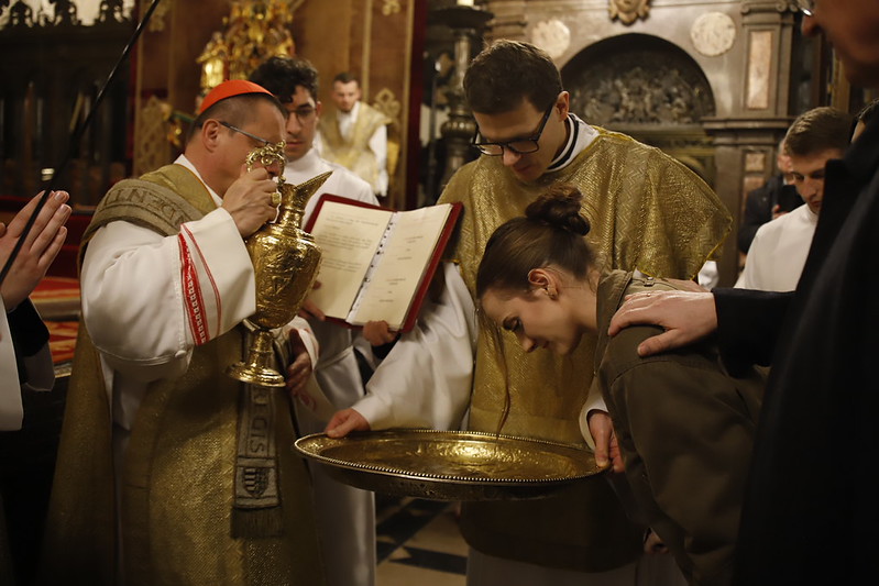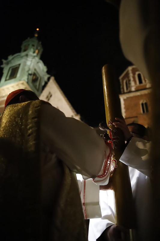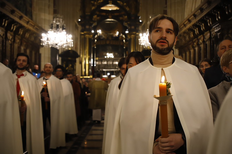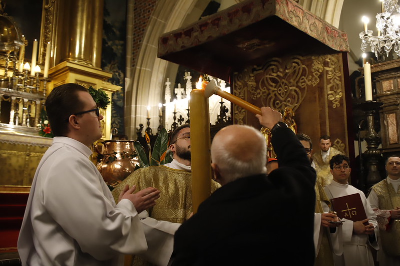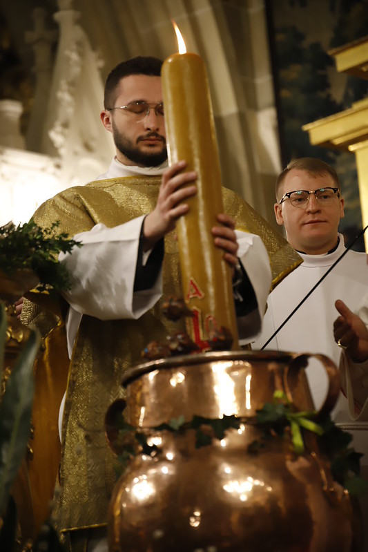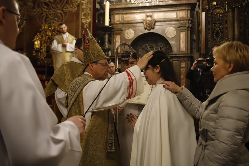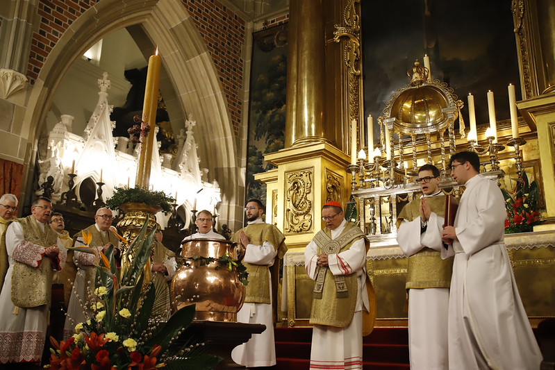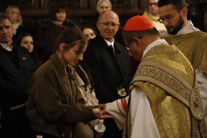 4 kwietnia 2026 r., w Wigilię Paschalną celebrowaną w Katedrze Wawelskiej 12 wybranych przyjęło z rąk Ks. Kardynała Grzegorza Rysia sakramenty wtajemniczenia chrześcijańskiego. 11 osób przygotowywało się w naszym Ośrodku Katechumenalnym, jedna osoba w parafii pw. św. Brata Alberta w Krakowie. Celebracja rozpoczęła się o 21.00 Liturgią światła, potem przeżywaliśmy Liturgię Słowa (czytania przeprowadziły nas przez Historię Zbawienia), komentowaną w trzech homiliach przez Ks. Kardynała. Potem zostało otwarte źródło chrztu dla naszych Wybranych – wyrzekli się zła, wyznali wiarę, przyjęli sakrament chrztu, bierzmowania i po raz pierwszy zjednoczyli się z Chrystusem w Komunii świętej. Idąc dalej, wszyscy pozostali wierni odnowili przyrzeczenia chrzcielne i zbliżyli się do Pana. Na zakończenie udaliśmy się wszyscy w procesji rezurekcyjnej, by wraz z dzwonem Zygmunta obwieścić światu, że Pan zmartwychwstał i żyje. Że jest w nas i pośród nas! Poniżej zamieszczamy galerię zdjęć (fot. Biuro Prasowe Archidiecezji Krakowskiej).