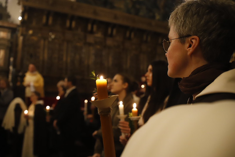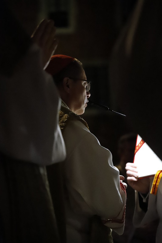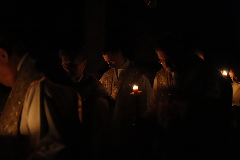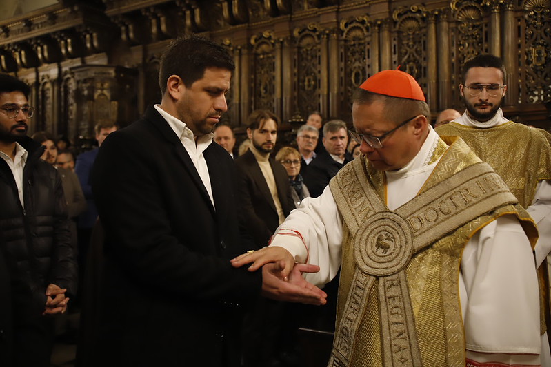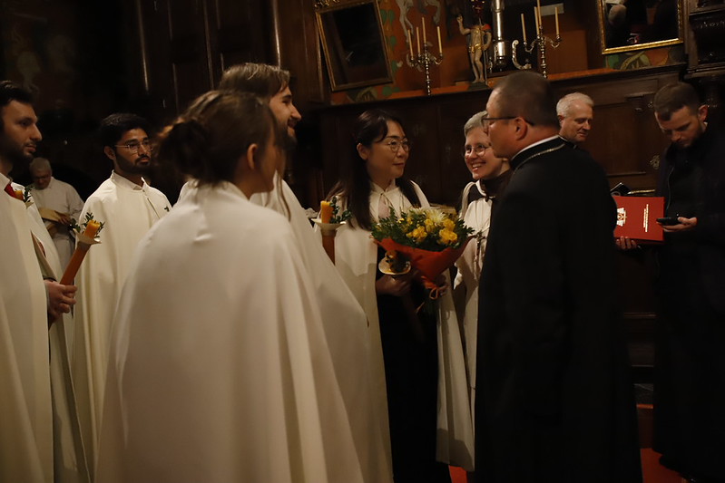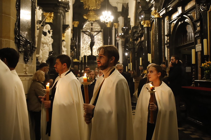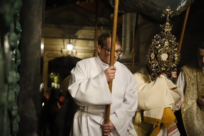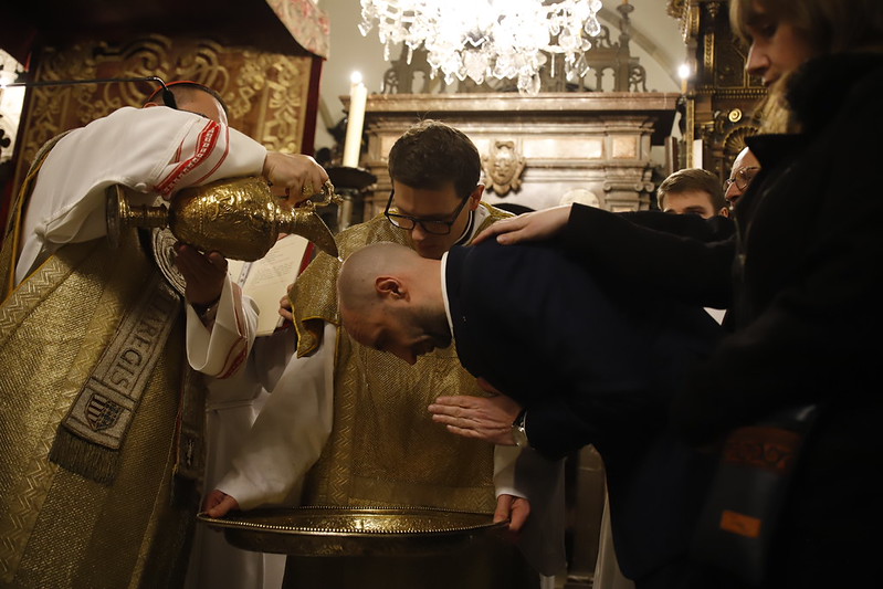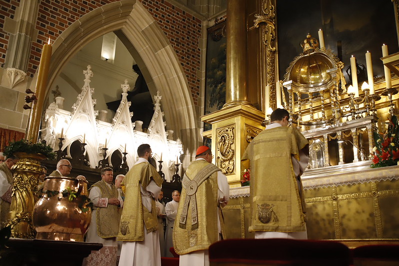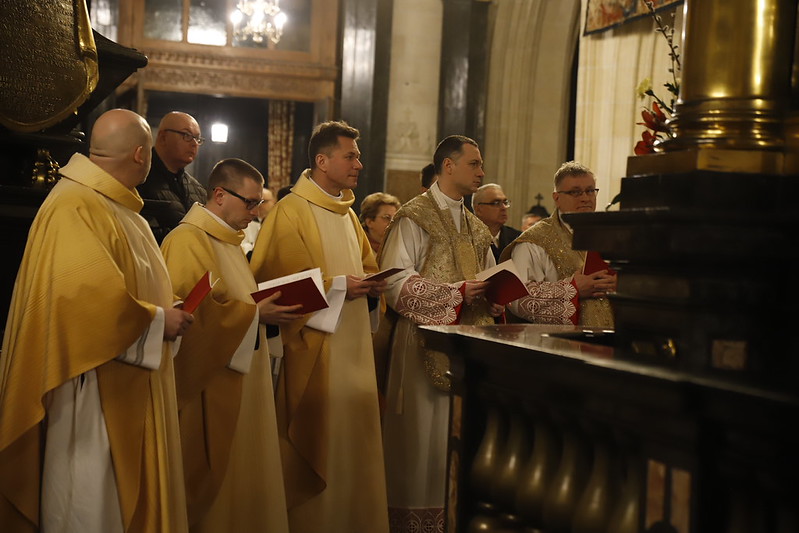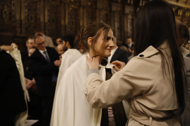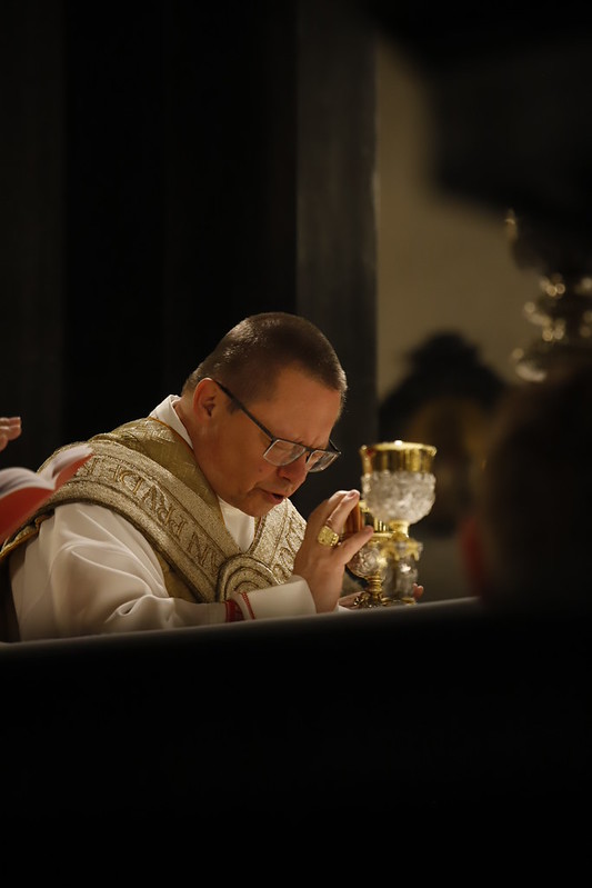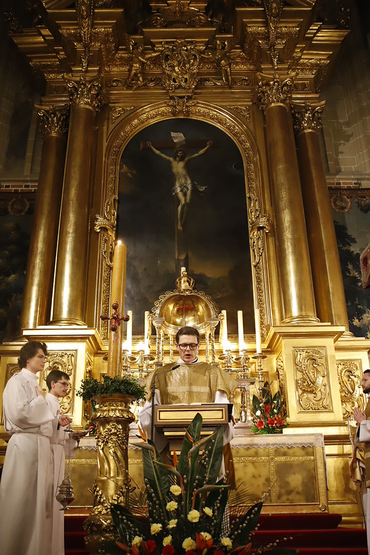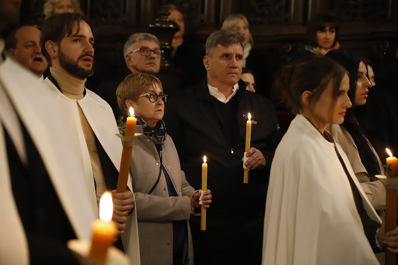 4 kwietnia 2026 r., w Wigilię Paschalną celebrowaną w Katedrze Wawelskiej 12 wybranych przyjęło z rąk Ks. Kardynała Grzegorza Rysia sakramenty wtajemniczenia chrześcijańskiego. 11 osób przygotowywało się w naszym Ośrodku Katechumenalnym, jedna osoba w parafii pw. św. Brata Alberta w Krakowie. Celebracja rozpoczęła się o 21.00 Liturgią światła, potem przeżywaliśmy Liturgię Słowa (czytania przeprowadziły nas przez Historię Zbawienia), komentowaną w trzech homiliach przez Ks. Kardynała. Potem zostało otwarte źródło chrztu dla naszych Wybranych – wyrzekli się zła, wyznali wiarę, przyjęli sakrament chrztu, bierzmowania i po raz pierwszy zjednoczyli się z Chrystusem w Komunii świętej. Idąc dalej, wszyscy pozostali wierni odnowili przyrzeczenia chrzcielne i zbliżyli się do Pana. Na zakończenie udaliśmy się wszyscy w procesji rezurekcyjnej, by wraz z dzwonem Zygmunta obwieścić światu, że Pan zmartwychwstał i żyje. Że jest w nas i pośród nas! Poniżej zamieszczamy galerię zdjęć (fot. Biuro Prasowe Archidiecezji Krakowskiej).