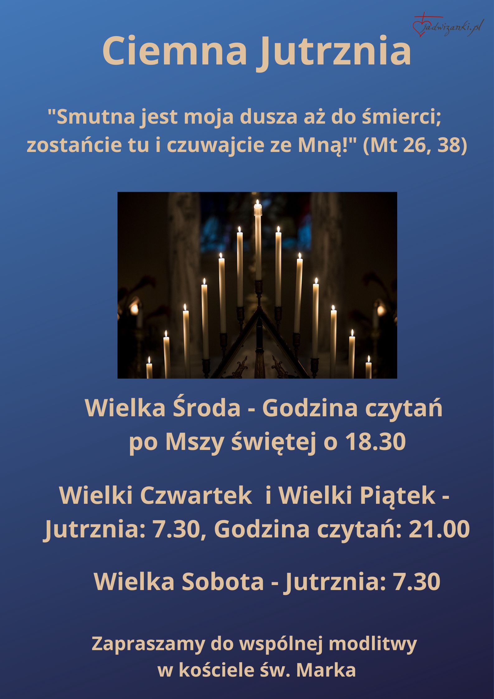 Zapraszamy do udziału w Liturgii Ciemnych Jutrzni. Przez wiele wieków, kiedy rozpoczynało się Święte Triduum Męki, Śmierci i Zmartwychwstania Pańskiego, uczniowie Chrystusa podejmowali czuwanie przy Obecnym. Zanim bowiem „wstąpił w przepaść” zbawczej męki, był sam na sam z Ojcem. Prosił, by przy Nim czuwać. Przychodząc na Ciemną Jutrznię chcemy wejść w tę samą…