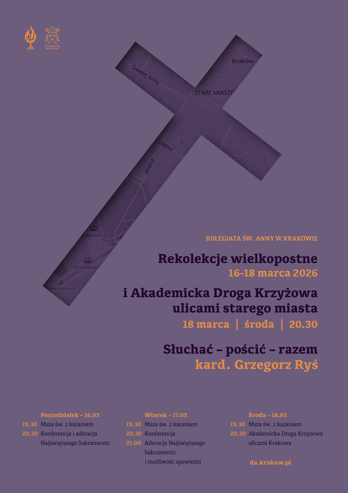 Zachęcamy do wzięcia udziału w Akademickich Rekolekcjach Wielkopostnych, które poprowadzi ks. kard. Grzegorz Ryś, metropolita krakowski w kolegiacie św. Anny. Rekolekcje zakończymy Akademicką Drogą Krzyżową ulicami Krakowa. Ludzie Ewangelii, daleko nieście Imię Chrystusa – także wobec całego Krakowa.